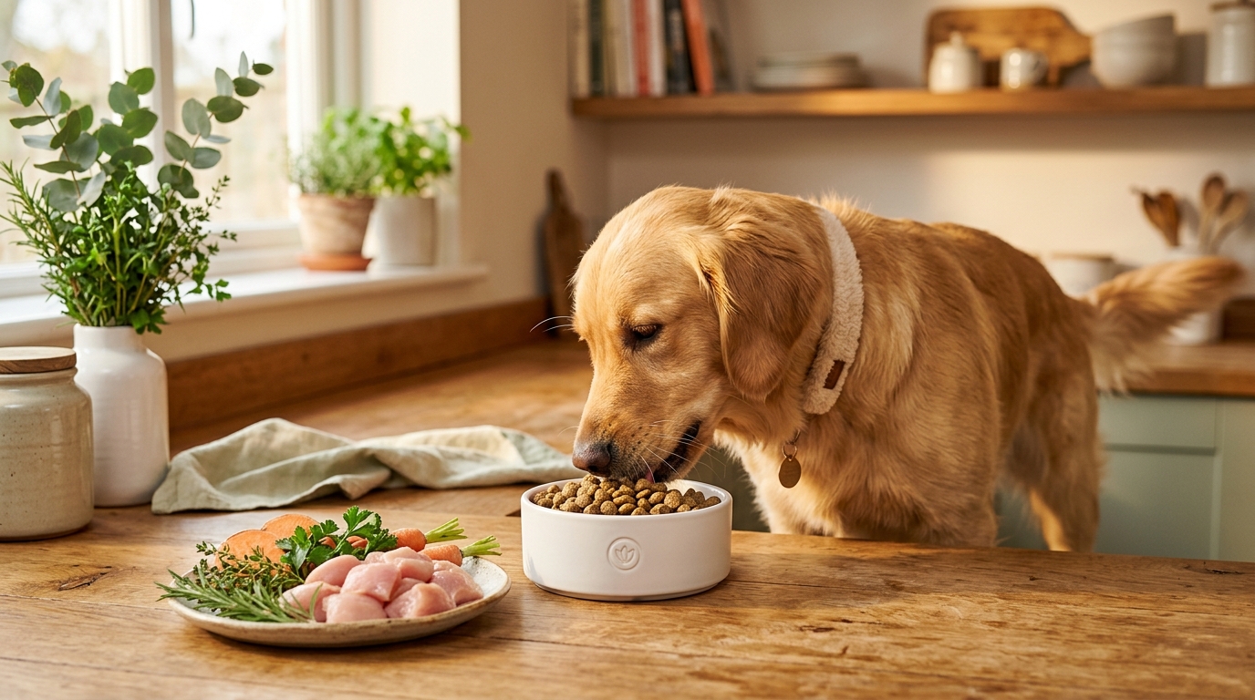 シニア犬のケアはグッズだけでなく、毎日の食事が非常に重要です。消化機能が低下してくる7〜8歳以降は、フードの原材料や栄養バランスを見直すことで、健康維持のサポートにつながる可能性があります。